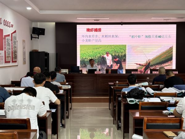 培训中,谢成林研究员从保障地区粮食安全生产角度,结合目前宝应县水稻生产特点,对比分析了机插与直播方式各自特点;互动过程中应种粮大户的要求,针对直播稻的苗期管理难,杂草、杂稻发生风险高,倒伏减产现象频发等问题,着重提出了“五改”建议,并从“品种选择、水肥管理”等10个方面,系统介绍了适宜本地区的水稻高效生产管理方案。张家宏研究员从提升稻田产出效益角度,图文并茂的介绍了稻渔种养典型模式类型和“12字”管理秘诀;种粮大户借助现场赠送的“一稻三虾”、“一藕三虾”技术模式图,边听边看,互动频繁。