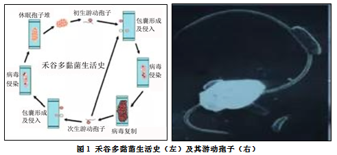 禾谷多黏菌的侵染循环从携带病毒开始,当其侵染植物时,首先由休眠孢子开始萌发,产生一些游动孢子,游动孢子可以附着在根部细胞表面,通过不断运动侵染到寄主植物的根部。病毒可在寄主植物体内不断复制并大量积累,病毒积累到一定程度的植株即呈现症状;而未带毒的禾谷多黏菌通过游动孢子侵染带毒植株根部从而获得病毒,变成新的毒源侵染其他植株。通过不断侵染,病害不断加重,在田间呈现大范围发病。