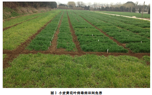小麦黄花叶病的发生流行与品种抗性、气候因素、栽培管理等条件密切相关。其中小麦品种的抗病性强弱对小麦黄花叶病发生流行具有重要的影响, 而小麦播种后的土壤温湿度、次年小麦返青期的气温及栽培管理是影响此病发生的关键因素。因此,防治过程一定根据病害爆发的影响因素采取针对性措施。